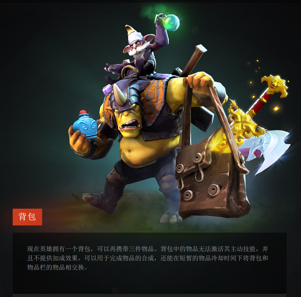 现在英雄拥有一个背包,可以再携带三件物品。背包中的物品无法激活其主动技能,并且不提供加成效果,可以用于完成物品的合成,还能在短暂的物品冷却时间下将背包和物品栏的物品相交换