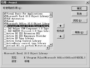 打开VBA编辑器,从工具选单中选择引用命令,选定Microsoft Excel 10.0对象库并确定(见图2)。