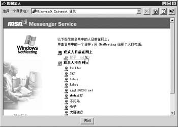 安排联机会议的方法是,打开会议共享文档,执行[工具]→[联机协作]→[现在开会]命令。首次启动联机会议时,会提示从“目录”下的“服务器名”列表中选择目录服务器,选择微软的“Microsoft Internet 目录”服务就可以了。NetMeeting自动连接服务器,并进入用户选择界面(如图1)。