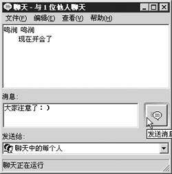 在联机会议中除了可以共享编辑文档外,还可以进行“闲谈”。只有联机会议的主持人能够打开闲谈功能,单击“联机会议”工具栏中的[显示闲谈窗口]按钮,即可打开闲谈窗口(如图3),在“消息”中输入文字,消息即显示在对方的屏幕上。