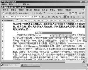 建立了一个联机会议后,点击与会者名称即可向其发出邀请。作为被呼叫参加会议的人员,会收到一个邀请参加联机会议的消息,当您接受邀请时,“联机会议”工具栏和要共享的文档就出现在屏幕上了。图2就是与会者的联机会议文档界面,在这里可以看到会议主持人修改文档的动作。