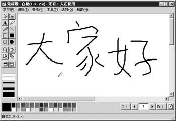 在会议中还可以打开“白板”进行文本、图像的演示。白板是NetMeeting 中的一种功能,它可以打开一个独立的窗口,联机会议参与者可在该窗口中键入文本、绘制图形、复制、粘贴和删除对象以及突出显示或指向文本和图形等。在“联机会议”工具栏单击[显示白板]按钮,即可进入白板窗口(如图4),现在可以自由进行绘图、录入文字的操作了,在白板窗口左侧提供有丰富的功能按钮可供选择。