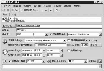 前些日子,我把王主任要的材料发到了他的信箱里,头儿很是满意,打回电话说活儿干得不错。冰雪儿来了精神,对着话筒喊道“开个会表彰宇飞吧”。王主任想了想说,那就等出差回去再说吧。冰雪儿却说:“听说Office XP支持远程联机会议,用一用?”王主任立刻说,“宇飞,你就好好研究一下那个联机会议,顺便在会上讨论一下本季度的工作计划安排吧”。