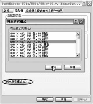 右击桌面空白处,选择“属性”,打开显示属性窗口,在“设置”标签中按“高级”按钮,在弹出窗口中选择“适配器”标签,点击“列出所有模式”按钮,在“列出所有模式”窗口中选择所需要的模式(比如640×480@256色)后,按“确定”即可。