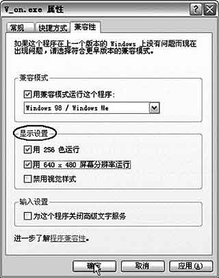 也许你会说,我只在运行要求分辨率为640×480软件和游戏时设置,每次都这么改太麻烦了!其实你可以右击要运行软件和游戏的快捷方式或程序图标,选择“属性”,然后在属性窗口中选择“兼容性”标签,在显示设置中,可设置“用256色运行”、“用640×480屏幕分辨率运行”、“禁用视觉样式”等。