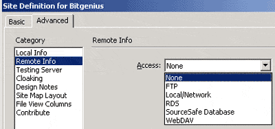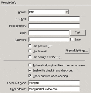 不过很多人会发现它是灰色不可用的,这是因为我们还没有建立一个可用的站点,或者说我们当前的文件不在一个可识别的站点中,使用FW的站点管理功能,首先必须建立一个FW可识别的站点,而这个站点的建立是由DW来完成的,所以我们先来在DW中建立一个站点。FW要求在DW中建立的站点必须包含一个远端站点的定义,如下图: