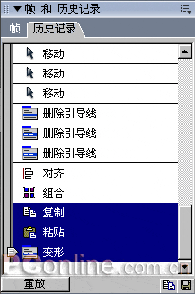 在“编辑—首选参数”的“首选参数”窗口的常规选项卡中,把撤消步骤由默认的20步改为40步。然后启动“历史记录”面板,从中可以看到,我们最后所操作的三个步骤都记录在案。将这三个步骤同时选中后连续地点击“重放”按钮37次。如图10。