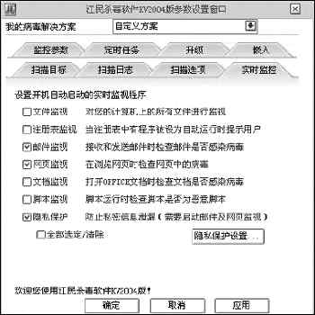 可以借助有隐私保护功能的杀毒软件,以KV2004为例。首先应当把“实时监控”中的“隐私保护监视”打上勾。