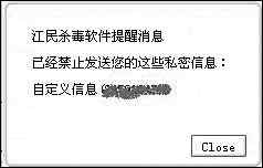 在讲述完它的使用方法,我又做一个简单试验:随便将一串数字设置成隐私保护试了一下,选择了“检测到隐私后处理办法”为“禁止发送私密信息”,果然,在我向一家非安全服务器网站提交含有该字符串的信息时,出现了如图2所示的提示,以邮件的形式发送也会有相同的提示。