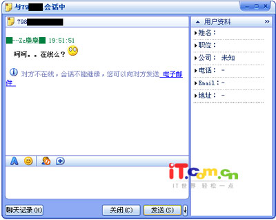 接下来我们就在聊天对话框中给你怀疑隐身的QQ网友发送信息,如果好友在线或隐身,信息就会成功发送,如果好友离线,发送信息之后,就会出现一个提示:“对方不在线,会话不能继续,您可以向对方发送 电子邮件”(如图4)
