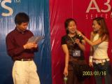 接下来就是大家期盼已久抽奖活动了,率先中奖的是216号玩家马虎,可是对自己得奖可一点都不马虎,100颗装升级宝石一箱,在众人羡慕的眼光中喜滋滋的搬走!在另外两名幸运玩家也分别拿走渴望已久的奖品后第一轮的抽奖暂告段落,马上上演的是一个别开生面的游戏:上海玩家代表队真人PK北京玩家代表队!别着急,只是顶气球比赛而已。游戏规则不能用手,只能用头和胸部控制气球,尽量往对方的界线顶过去,先使气球着地者算输。北京方面派出的是北京热身赛线下亚军王佳、线上亚军孙铖,和传说中的线下线上总冠军…..的亲密爱人李胜晟。尤其是李胜晟,1米90的高度占了绝对优势!而上海方面也毫不逊色,虽然高度上差了一点点,但用上海玩家的一句话,顶球靠的是灵活,所以这场真人战役鹿死谁手还是个未知数。主持人一声令下,比赛开始了,台下的玩家充分发扬了东道主的风格,为北京队加油的大有人在,场上6名玩家你来我往顶的不亦乐乎,最后上海玩家由于计算失误,气球从分界线下落入对方场地。北京队侥幸获胜。