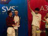 嘉宾发言过后,最激动人心的时刻到来了,主持人请所有玩家起立,迎接远道而来的赛旗和奖杯。随着庄严而肃穆的音乐响起,北京地区热身赛冠军选手乐意手持奖杯走在最前端,身后跟着四名运动员高举SVS大会旗帜入场,乐之魂上海地区区冠军钱岚接过乐意手中的奖杯,赛旗也传给了上海的地区的运动员。如果说,历经近3个月的A3《乐之魂》全国主唱歌手选拔大赛活动,是A3的Art艺术方面一个最好的展示的话,那现在A3 SVS活动,将是A3的Alive、Attract活力、魅力的展示,而此时,当SVS北京地区热身赛冠军和乐之魂上海地区冠军共同高举奖杯的时候,正是A3艺术、活力、魅力一个完美的结合!从所有台下的玩家们的眼睛里,看到了坚定和自信。我是最强的!!!熟悉的音乐再一次响起,乐之魂总冠军秦丽的一首《勇敢》再一次打动了现场所有的玩家。