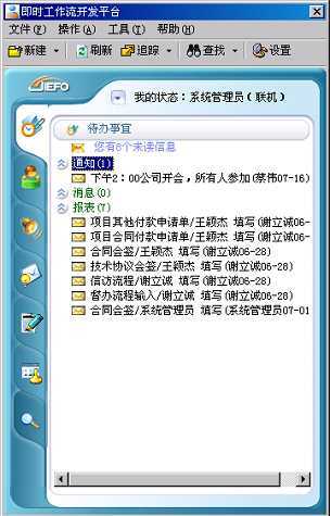 近日,北京杰佛软件公司对外正式发布了其最新产品“即时工作流开发平台Message FlowMIS5.0”,该产品是其畅销产品FlowMIS4的一次重大升级,它基于微软的DotNet架构全部重新设计,不仅仅功能和性能上有了较大提高,更关键的是,它是国内第一款采用MSN模式开发的企业管理软件,它将带来企业管理软件在沟通、操作、开发、工作流四个方面的巨大变革。