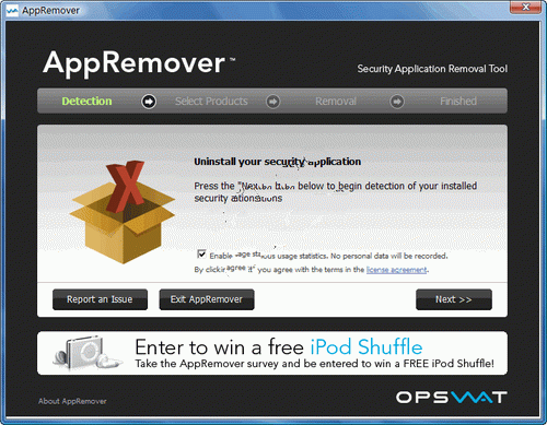 | · AppRemover几乎支持目前所有主流杀毒软件的移除。瑞星也是榜上有名,金山江民未能入选。目前仅用在windows系统上,且免费。