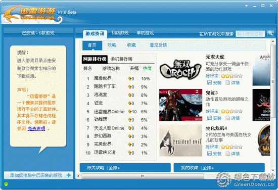 | · 迅雷游游是集搜索、下载、更新升级为一体的绿色游戏平台,能够协助游戏用户快速找到网上的游戏资源,并协助用户通过极其简单的操作完成游戏的获取与安装升级过程而直接享受游戏的乐趣。