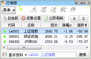 | · “行情眼”是杰思达软件工作室开发的一款股票行情 数据实时查看工具, 操作简单、界面美观、体积小、省资源;具有个股报警功能(支持声音、弹出窗口、托盘动画三种方式),从此您不用再时刻紧盯行情数据;更有专为公办室一族量身打造的老板键、透明窗口、托盘、焦点股票等功能;除基本...