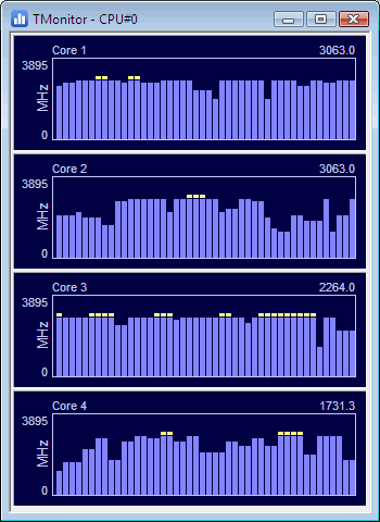 | · CPUID TMonitor CPU面比较简单,TMonitor通过柱状图显示CPU每个核心的实时频率变化(刷新频率为每秒20次)。另外,可支持Turbo Boost技术的CPU,提升频率数据则以黄色表示。软件界面还能够切换为实时显示CPU的倍频变化情况。