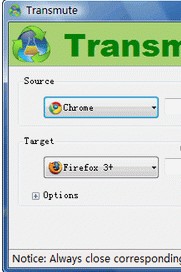 | · Transmute可以帮助用户在各个浏览器之间快速便捷进行书签的相互导入/导出,其支持当前主流独立核心浏览器,包括最新的Google Chrome、Mozilla Firefox 3 和 Opera。相互间导入导出的书签可以集合为一体,而不是覆盖原有的旧书签文件。