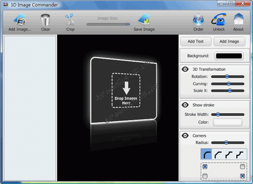 | · 3D Image Commander可以方便地为图片创建具有3D风格和效果的缩略图,包括3D旋转、3D扭曲、倒影、阴影、边角等效果并支持添加文本(可视作为图片添加水印);3D Image Commander支持BMP、JPG、GIF、PNG、TIFF、PSD等格式