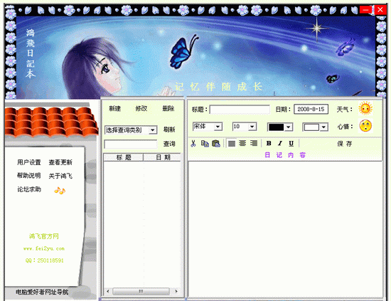 | · 鸿飞日记其实是为自己编写的,以前也找过一些日记软件,但是都感觉不太好,所以就自己动手写了一个,现在发布出来和大家一起分享,希望大家喜欢!