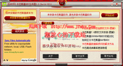 | · 卡巴斯基Key生成助手 使用本软件能够完全激活卡巴各个版本, 每个版本的KEY文件都检测有效再发布,每4个小时检验一次。本工具为绿色版。没有任何插件,有什么建议和意见可以反馈给我们 ,我们会做的更好。