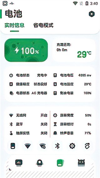 监测电池的温度和历史使用情况,实时展示电池使用状态,包括:电池健康程度、充放电状态、电压、剩余电量、温度等。