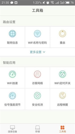 【工具箱】在这里你可以看到路由设置和智能应用等信息,你可以随时更改无线名称和密码,还可以实现WiFi一键加速哦。