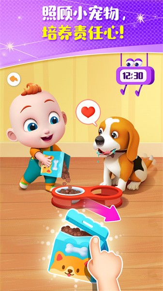是谁在汪汪叫?是小狗Bingo!它的肚子快饿瘪了,需要进行喂食,宝宝来帮帮忙:撕开狗粮袋,倒满宠物餐盆。Bingo好像没吃饱?使用开罐器,再为它开一个宠物罐头吧。Bingo出去“兜风”咯!呀,它玩得一身脏,还需赶紧清洗:用夹子,清理Bingo身上的杂草;举起刷子,刷洗爪子上的泥块;为浴花挤上沐浴露,还能给Bingo做个泡泡Spa。