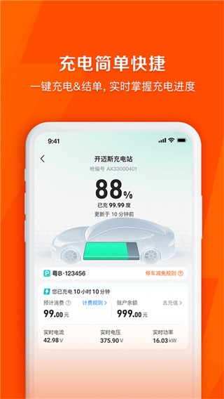 实时传输电桩充电数据,轻松查看充电时间、充电度数、消费金额等充电进展。