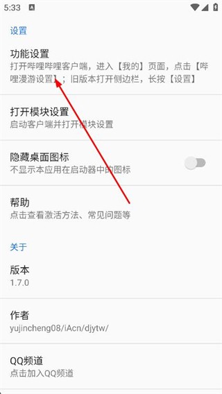 1、打开哔哩漫游,点击上方的功能设置。