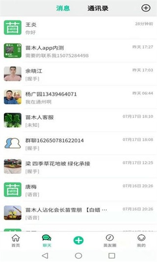 支持添加好友创建群聊,一键群发供需信息,苗友圈分享经营动态,实时通话沟通合作细节,以苗会友拓展人脉资源促进跨区域交易。