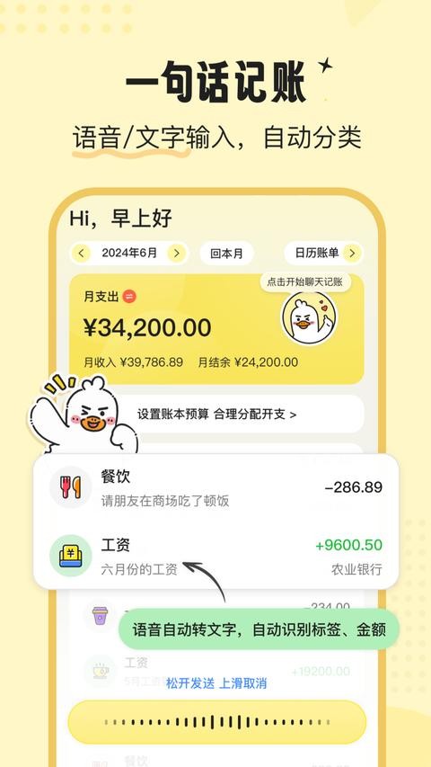 1. 智能分类记账:飞鸭AI记账通过人工智能技术自动识别消费类型,用户只需输入金额或使用语音输入,系统即可将消费记录归类到餐饮、交通、购物等不同类别中,无需手动选择,大大提升记账效率。