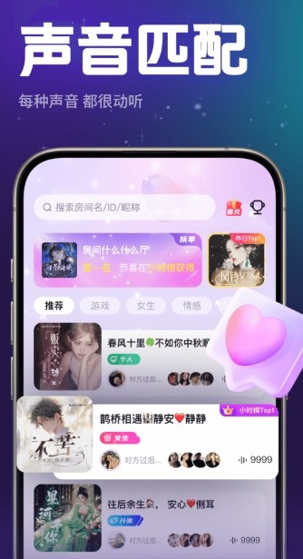 独家研发的声纹社交系统,可通过声音快速建立用户画像。语音传输采用5G边缘计算技术,流量消耗降低40%。变声引擎获得多项音频处理专利技术认证。直播功能整合了虚拟形象驱动技术。游戏平台接入了区块链成就系统。界面设计获得2023年红点设计大奖提名。