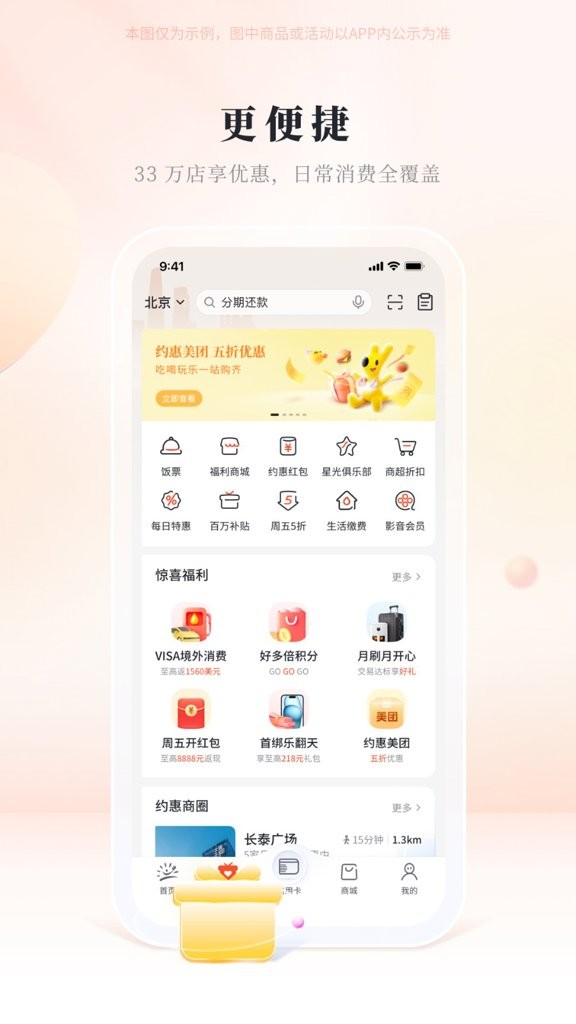阳光惠生活是光大银行信用卡官方精心打造的一款集金融与生活服务于一体的智能APP。作为光大银行信用卡用户的专属应用,它不仅提供安全可靠的金融服务,更为用户带来丰富多彩的生活福利。在这里,您可以轻松完成账单还款、额度查询、分期办理等金融操作,同时还能参与每日签到、抽红包、积分兑换等趣味活动,让理财过程充满惊喜。简洁流畅的操作界面和人性化的功能设计,让每一位用户都能快速上手,享受便捷高效的使用体验。
