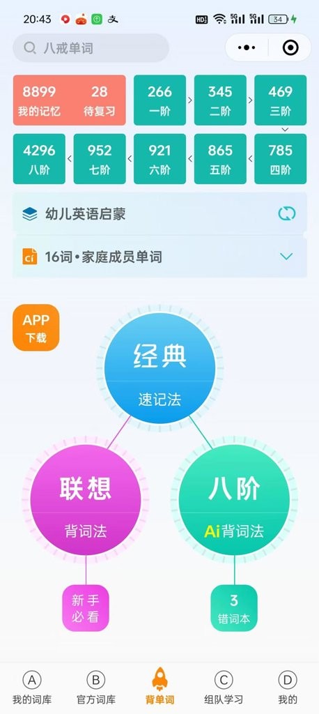 登录成功之后,如图所示,在背单词界面中提供从1阶到八阶的全阶段的单词学习内容,而且还有经典和联想背单词方法,