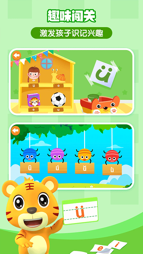 贝乐虎拼音是一款拼音智慧学习软件,专为儿童设计。软件全面覆盖拼音字母表中声母、韵母及整体认读共63个拼音,依据科学教纲精心设计了丰富多样的学习内容,使用丰富童趣的形式引导儿童学习拼音字母,并搭配趣味游戏练习进行互动教学,知识要点巩固毫无压力,让孩子在寓教于乐的过程中激发自己的学习兴趣,轻松、快乐地学习拼音。
