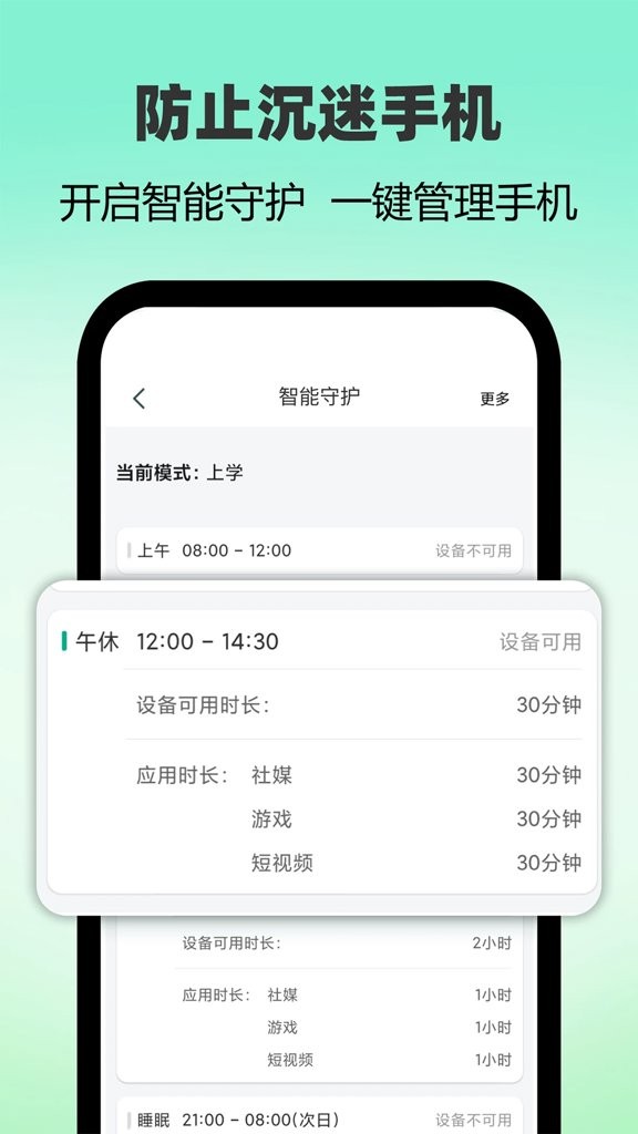 新增自定义时间模板,家长可一键设置不同时段的使用规则。