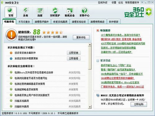 据《中国电脑教育报》日前出具的一份评测报告显示,在10款国内网民常用安全软件的扫描速度横向评比中,360安全卫士刚刚发布的6.0正式版取得惊人成绩:在同样的软硬件环境下,360“云查杀引擎”比普通杀毒引擎的平均扫描速度快了10倍以上!快速扫描一次