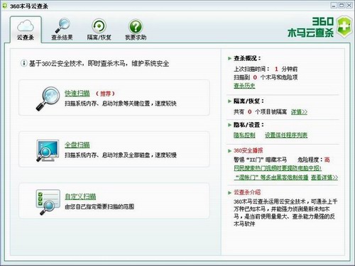 9月15日,360安全卫士打破杀毒行业20年常规,推出用户无需升级木马库就能查杀木马的“云查杀引擎”,首创安全软件“0秒升级”模式。360公司董事长周鸿祎表示,杀毒软件的特征库升级机制沿袭了20年,资源占用过大和滞后查杀的弊端日益明显,3
