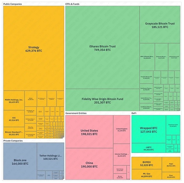 若该法案全面实施,美国将累计购入 100 万枚 BTC(约占 2100 万枚总量上限的 4.8%)。相较之下,目前最大比特币持仓上市公司 MicroStrategy 持有 62.9 万枚(占比约 3%),该储备规模将超越任何单一 ETF 持仓,甚至显著超越 bitcointreasuries.net 统计的全行业 ETF 总持仓量(约 163 万枚)。