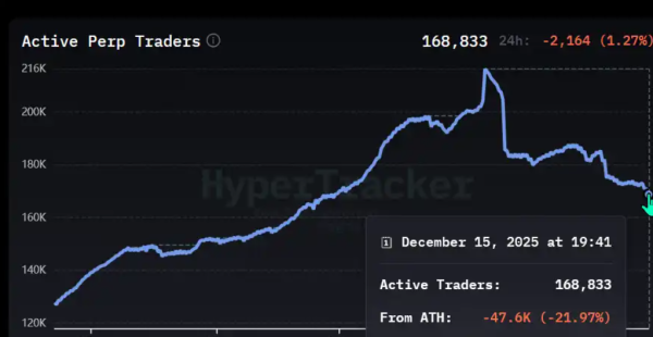 BlockBeats消息,12月15日,据HyperTracker数据显示,目前Hyperliquid平台活跃合约交易地址暂报168,833个,较11月初的历史最高数据减少4.76万个(-21.97%)。
