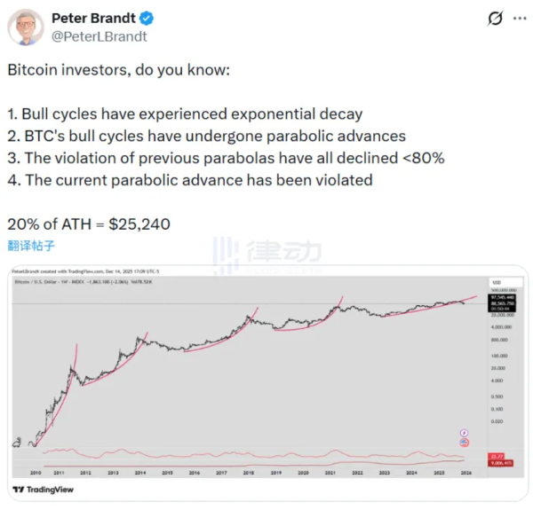 12月15日,曾成功预测2018年比特币暴跌的著名交易员和图表分析师Peter Brandt今晨发文表示,牛市周期经历了指数级衰减,本轮比特币的牛市周期经历了抛物线式上涨,当前已跌破抛物线,而此前跌破抛物线后平均跌幅达80%。