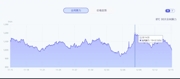 12月15日,据F2pool数据,比特币全网算力暂报988.49EH/s,距离上周同一时刻下跌17.25%。