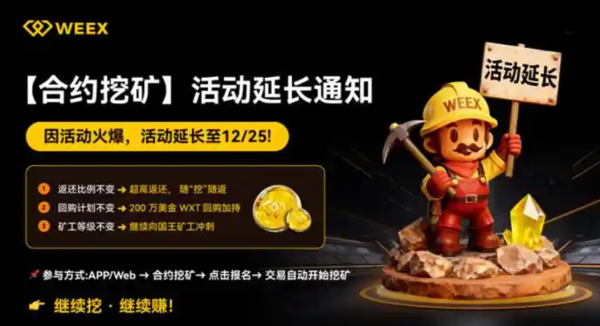 由于「合约挖矿」机制新颖、奖励丰厚,且支持秒级结算,奖励实时到账,该活动上线后每日新增参与人数和交易量屡创新高,更有不少用户反馈希望活动延长一段时间。为此,WEEX已对本次活动展期10天,截止时间由原定的12月15日延期为12月25日,以使得更多用户有充足时间参与活动,持续享受挖矿返还福利。