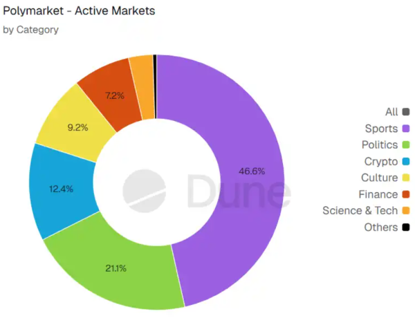 12月17日,据Dune数据显示,预测市场Polymarket未平仓合约量年内不断攀升,近日创下年内最高点约3.26亿美元,较年初的约1.2亿美元增长近170%。市场结构上体育、政治、加密三大板块份额位列前三,分别为46.6%,21.12%和12.4%。此外,由于每月末大量市场盘口结算,每当月底大约有三分之一的未平仓合约被平仓。