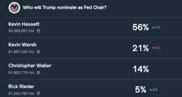 12月19日,美联储理事沃勒与特朗普就美联储主席一职进行了「富有成效的面试」,Polymarket上预测其成为下一任美联储主席概率暂报14%。此外,沃什被特朗普提名的概率降至21%,而哈塞特被提名概率升至56%。