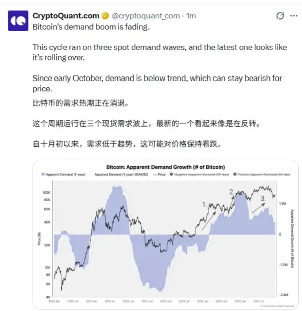 12月19日,CryptoQuant在社交媒体上发布数据表示,比特币的需求热潮正在消退。本轮周期经历了三波现货需求浪潮,而最新一波似乎正在走向结束。
