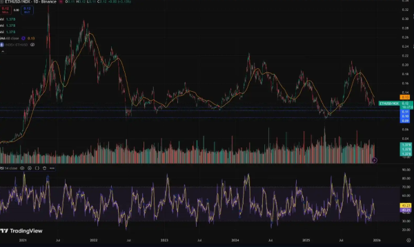 12月19日,「BTC OG内幕巨鲸」代理人Garrett Jin发文表示,历史上,ETH/纳斯达克100指数的比率多次在0.11附近触底,这与RSI接近30「超卖」区域相吻合,证明ETH目前正处于底部区间。展望未来,以太坊在未来几个月内跑赢纳斯达克100指数的概率增加,目标比率在0.16到0.22之间,这意味着大约有50%到100%的上涨空间。