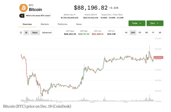 目前最大的加密货币在假日前的周末保持相对稳定,现报88,400美元,过去24小时内上涨0.3%。