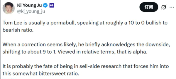 12月20日,CryptoQuant创始人Ki Young Ju发文评论称,Tom Lee长期以明显偏多立场著称,其看多与看空观点比例约为10:0。